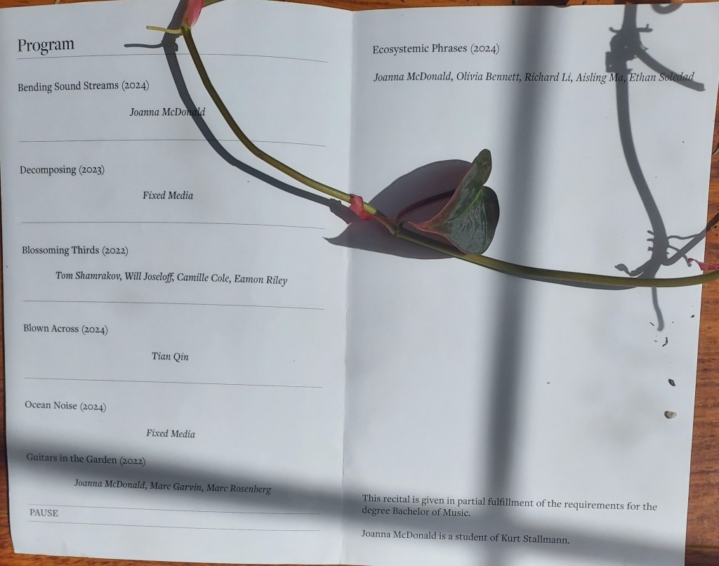The second and third pieces on the program are mixed-media compositions that aim to demonstrate the natural processes of decomposition and rebirth in plants, as well as in personal growth. “Decomposing” is a fixed media and video piece created from recorded sounds of the string quartet, “Blossoming Thirds.”